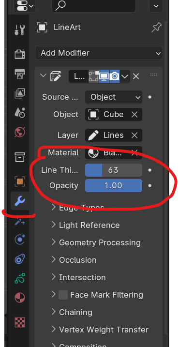 3. Now select the line art and go to modifier option,now adjust the line thickness,opacity as you need